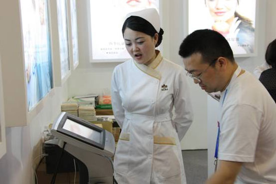 慈銘奧亞健康管理醫院的護士為參會者測量體脂肪數據,數據可直接上傳至慈銘健康管理云服務平臺